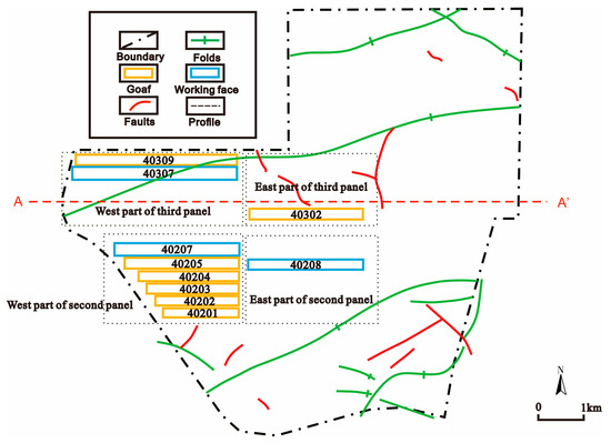 This study utilizes geological and hydrogeological data, along with field measurements, from the Xiaozhuang Coal Mine. The mining area is divided into four zones: western and eastern sections of Panel 2, and western and eastern sections of Panel 3 (Figure 4). To date, working faces 40201–40205 in the western Panel 2, 40302 in the eastern Panel 3, and 40309 in the western Panel 3 have been mined, generating extensive water inflow data.