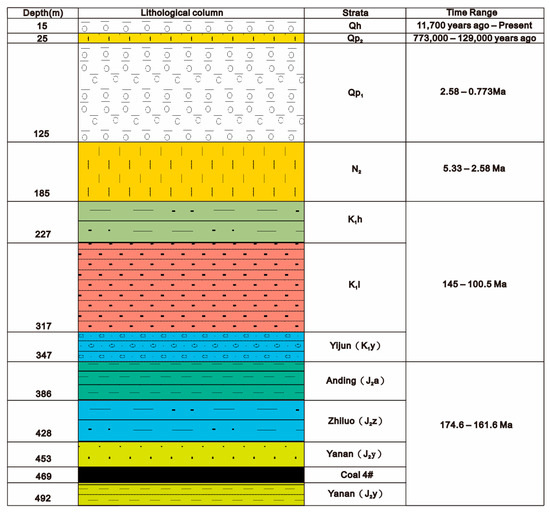 The Xiaozhuang Coal Mine area is predominantly covered by quaternary loess and Neogene laterite. The Lower Cretaceous Luohu Formation is exposed along the Jinghe River and in larger valleys such as the Hongya River, while the Huachi Formation is exposed within the Hongya River valley. Based on borehole data and geological mapping (Figure 5), the stratigraphic sequence from oldest to youngest is as follows: