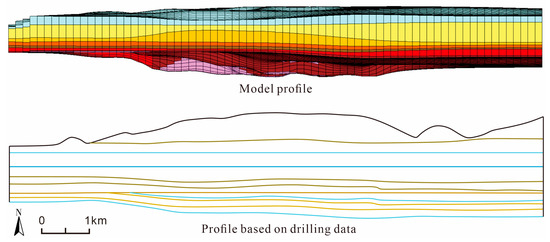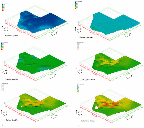 A comparison between the model cross-section and the borehole data profile A-A’ (as shown in Figure 8) indicates that the model exhibits high fitting accuracy in most areas of the coal mine. However, due to limited borehole data in the northeastern region, the model’s fitting performance is relatively poorer in this area. Since the focus of this water inflow simulation is on the western section of the coal mine, the minor deviations in the northeastern region are considered acceptable for the simulation results.