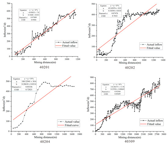 The dynamic prediction method was applied to simulate the water inflow variation curves during the mining advance of each working face in the Xiaozhuang Coal Mine (Figure 10). The analysis demonstrates a strong correlation between predicted and measured water inflow data, with the coefficient of determination (R2) ranging from 0.88 to 0.96.