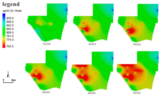 The simulation results (as shown in Figure 11) demonstrate significant changes in the seepage field of the Luohe Formation aquifer following the mining of working faces 40202, 40204, 40302, and 40309, as illustrated in the figure below. Notably, the water levels in both the Zhiluo-Yan’an Formation aquifer and the Luohe Formation aquifer exhibited a marked decline at the mined-out sections.