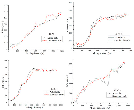 Extract the flow rates output from the water balance module for each working face during mining, and plot the variation curves of the numerical simulation results and measured data of the water inflow against the mining distance, as shown in the Figure 12.