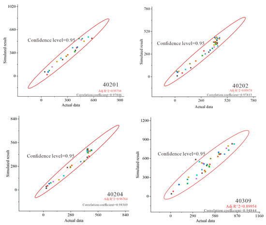 A correlation analysis (as shown in Figure 13) was conducted between the simulated and measured water inflow data of the working face. The results indicate a strong correlation coefficient ranging from 0.89 to 0.96, demonstrating the high reliability of the numerical simulation method in predicting water inflow.
