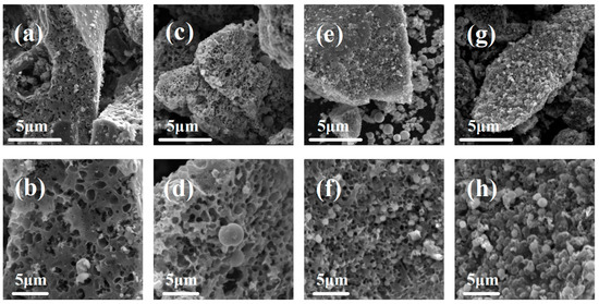 SEM images of BC (a,b), BC-CFO1 (c,d), BC-CFO2 (e,f), and BC-CFO3 (g,h).