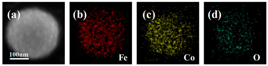(a) CoFe2O4 SEM image, (b) Fe element distribution map, (c) Co element distribution map, and (d) O element distribution map.