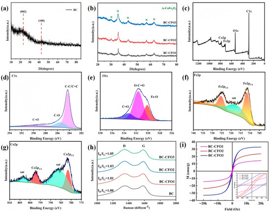 (a) BC XRD patterns, (b) BC-CFO XRD patterns. (c) XPS full survey spectrum. (d) High-resolution C 1s spectrum. (e) High-resolution O 1s. (f) High-resolution Fe 2p spectrum. (g) High-resolution Co 2p spectrum. (h) Raman spectra of BC and BC-CFO. (i) Magnetic hysteresis loops of BC-CFO.