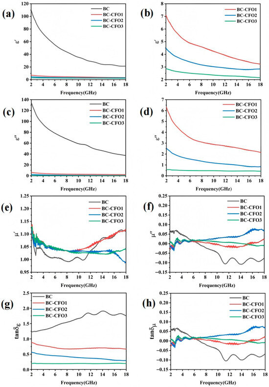 As shown in Figure 6a–d, the real (ε′) and imaginary (ε″) parts of the complex permittivity of BC are significantly higher than those of BC-CFO composites. This is because BC exhibits higher conductivity, thus leading to higher values of ε′ and ε″. However, the dielectric properties of CoFe2O4 magnetic particles are weaker, causing the real and imaginary parts of the complex permittivity of BC-CFO composites to decrease substantially with the increase of CoFe2O4 particle content. The values of ε′ for BC, BC-CFO1, BC-CFO2, and BC-CFO3 show a general decreasing trend, dropping from 110.33 to 21.28, 7.11 to 3.21, 4.50 to 2.83, and 2.93 to 2.15, respectively. This decrease is attributed to the lag in the response of dipoles to high-frequency electric field variations. Due to the dispersion effect, the values of ε″ for BC, BC-CFO1, BC-CFO2, and BC-CFO3 also show a downward trend, decreasing from 137.66 to 37.4, 6.32 to 2.15, 2.53 to 0.85, and 0.57 to 0.43, respectively. The ε′′ value of BC-CFO3 is nearly zero, indicating minimal influence from the dispersion effect.