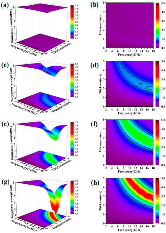 Figure 8 presents the contour plots of the impedance (Z) values for BC and BC-CFO composite materials at different thicknesses. When the impedance Z approaches 1, the material achieves better impedance matching, which allows more microwaves to enter and be attenuated. In this study, the 0.9 and 1.1 contours were selected to mark the Z values. As shown in Figure 8a,b, the Z value of BC is around 0.2, indicating poor impedance matching. In contrast, Figure 8c–h show that the BC-CFO composite materials, with CoFe2O4 particles introduced on the surface of BC, exhibit significantly higher Z values compared to BC alone. It is also observed that the Z value increases with the amount of CoFe2O4 particles introduced. The color band distribution in Figure 8c,d reveals that BC-CFO1 composite material has a broad and distinct band region where the Z value fluctuates near 1 over a wide frequency range. This contributes to the excellent microwave absorption performance of BC-CFO1 across multiple frequency bands.