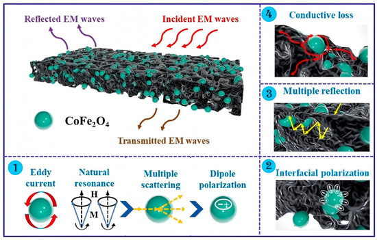 As shown in Figure 9, the microwave absorption mechanism of the BC-CFO composite can be attributed to the following factors: (1) Introducing magnetic CoFe2O4 particles into the composite provides a magnetic loss mechanism. Additionally, CoFe2O4 particles effectively adjust the dielectric properties of the composite, enhancing dielectric loss and improving impedance matching. (2) The heterogeneous interfaces between the CoFe2O4 particles and BC create strong interfacial polarization, while surface functional groups and structural defects derived from BC act as polarization centers, leading to intense dipole polarization. (3) The porous structure of the BC-CFO composite facilitates multiple scattering and reflection of incident microwaves, extending the propagation path and dissipating more microwave energy. (4) The low conductivity of CoFe2O4 particles interrupts the conductive pathways, dissipating additional electromagnetic energy during transmission and promoting the conversion of electromagnetic energy into heat, thereby enhancing the microwave absorption performance of the material.