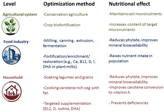 Table 2, summarizes, for each nutrient mentioned above, the aspects to consider in terms of its main source, bioavailability, and possible solutions to increase its amount in plants and plant-based foods.