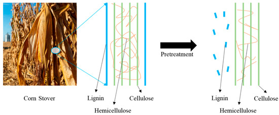As mentioned in Section 1, corn stover is recognized as a primary raw material for second-generation bioethanol due to its lignocellulosic structure, which consists of 38–40% cellulose , 28% hemicellulose , and 7–21% lignin [25]. For bioethanol production, access to cellulose and hemicellulose within the lignocellulosic matrix is required, but this matrix is encapsulated by a protective layer called lignin [26]. As illustrated in Figure 1, the conversion of corn stover to bioethanol necessitates a pretreatment stage to separate lignin from lignocellulose.