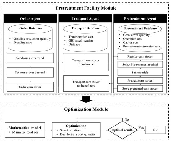This study develops a supply chain design for bioethanol production and determines the allocation of pretreatment facilities that minimizes total costs using agent-based simulation. Figure 2 presents the framework used for identifying the optimal pretreatment facility location. The framework is structured into two components: the pretreatment facility module and the optimization module. The pretreatment facility module comprises the order database, transport database, and pretreatment database. The order database provides information to estimate corn stover demand. The transport database contains GIS data and unit transportation costs for calculating transportation expenses (see Section 3.1 for additional details). The pretreatment database includes the costs associated with the corn stover pretreatment process. Each process step is modeled as a distinct agent to represent operations within the pretreatment facility according to the respective database information. The order agent modifies corn stover demand based on gasoline production volumes and the bioethanol blending ratio. Subsequently, corn stover is transported from the farm to the pretreatment plant by the transport agent. The pretreatment agent processes the corn stover received from the farm and evaluates both capital and operating costs of the pretreatment facility. This involves selecting the pretreatment method, preparing the required materials, and conducting the pretreatment of corn stover. Pretreated corn stover is then delivered to the refinery by the transportation agent (see Section 3.2 for further explanation). The optimization module utilizes a mathematical model to determine the optimal pretreatment facility location that minimizes the total cost of the bioethanol supply chain, drawing on inputs from the pretreatment facility module. The mathematical model is detailed in Section 3.3. Implementation is performed using AnyLogic® University 8.7.7 simulation software, Chicago, IL, USA. Additionally, explanations of the symbols in the formulas appearing in the subsections are provided in Appendix A.