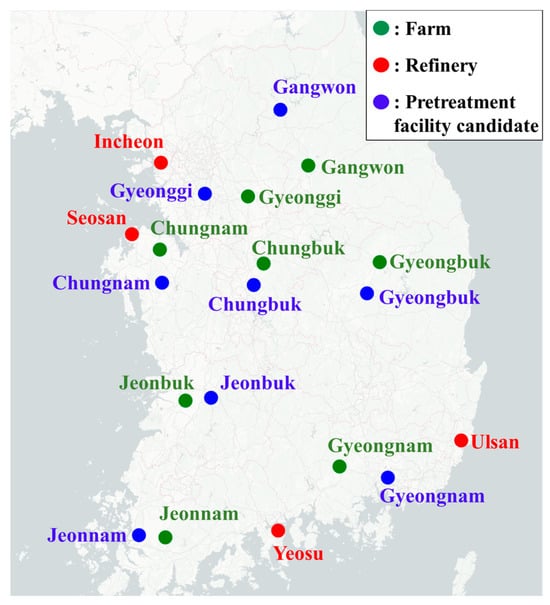 To determine the location for the pretreatment facility in bioethanol production, data were collected through a case study in South Korea. Figure 3 illustrates the locations of bioethanol supply chain facilities considered in this analysis.