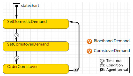 The order agent estimates the demand for bioethanol based on gasoline production quantities and the bioethanol blending ratio, subsequently requesting the corresponding amount of corn stover from farms. Figure 4 presents the state diagram of the order agent, which comprises three states: (1) set domestic demand, (2) set pretreated corn stover demand, and (3) order corn stover. Initially, to determine the required bioethanol for blending with automotive gasoline, domestic gasoline production and the established blending ratio are defined. Next, the sum of gasoline production () for each refinery is multiplied by the domestic gasoline production ratio () to calculate total domestic gasoline production using Equation (1). The overall corn stover demand is subsequently determined using , which factors in both the blending and conversion ratios.