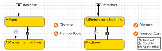 The transport agent is responsible for transferring corn stover among the farm, pretreatment facilities, and refinery. As shown in Figure 5, two distinct transaction types are represented. When the order agent submits a corn stover request, the truck transports corn stover from the farm to the pretreatment facilities. In another transaction, pretreated corn stover is collected from the pretreatment agent and delivered to the refinery. The truck routes are computed via the GIS module in AnyLogic®, supporting precise calculation of transport distances. Equation (2) in this model computes transportation cost based on both the transportation distance (i.e., , and ) and transportation quantity (i.e., , and ).
