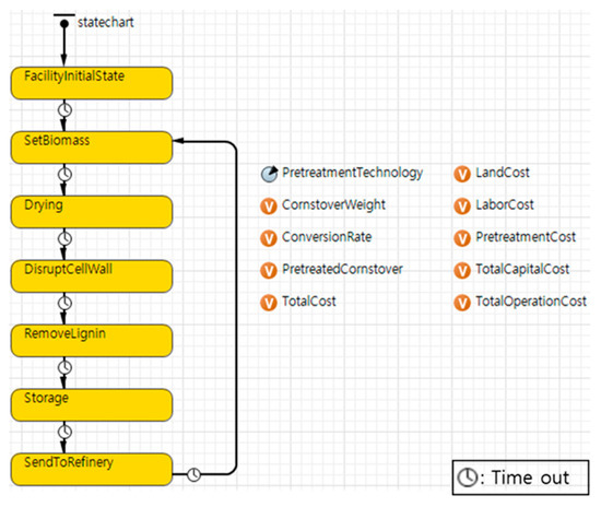 The pretreatment agent operates through 7 defined states: (1) Facility initial state, (2) Set biomass, (3) Drying, (4) Disrupt cell wall, (5) Remove lignin, (6) Storage, and (7) Send to refinery. Figure 6 depicts the state diagram for the pretreatment agent. Once a region is selected for the pretreatment plant installation, the total amount of corn stover () received at the facility is allocated equally among the chosen pretreatment plants via Equation (3).