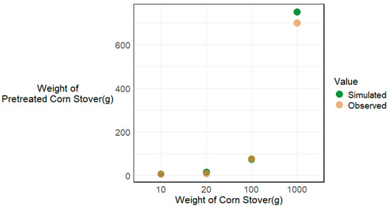 Model validation is performed by comparing results from the simulation model with the observed weights of pretreated corn stover in four different experiments. In a 2010 US experiment, 10 g of corn stover was pretreated with 100 mL of 15% ammonia [67]. In 2005, an experiment conducted in China pretreated 20 g of corn stover with 200 mL of 10% ammonia [68]. In another experiment, 100 g of corn stover from NREL, Golden, CO, USA, was pretreated with 500 mL of 30% ammonia [69]. Furthermore, 1000 g of corn stover harvested in China in 2012 was pretreated with 700 mL of approximately 143% ammonia [70]. The experimental conditions included temperatures set between 60 °C and 130 °C, and durations ranging from 10 min to 24 h. Figure 7 shows a comparison between the simulated and observed values for 10 g, 20 g, 100 g, and 1000 g of corn stover. A paired t-test is conducted to evaluate the consistency between simulated and observed results (see Table 9). Since the p-value is 0.3383, exceeding the significance level of 0.05, it indicates there is no statistically significant difference between the two datasets. Consequently, the proposed simulation represents the selected pretreatment technology’s operations with acceptable accuracy. A paired t-test is calculated using the standard statistical formula.