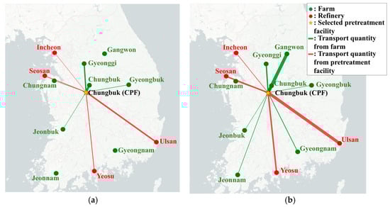 The optimal design of bioethanol supply chain network in South Korea: (a) 4% blending scenario; (b) 8% blending scenario.