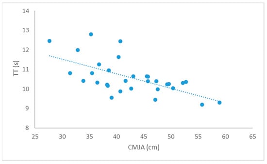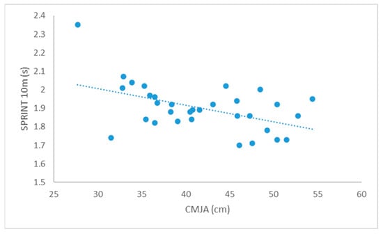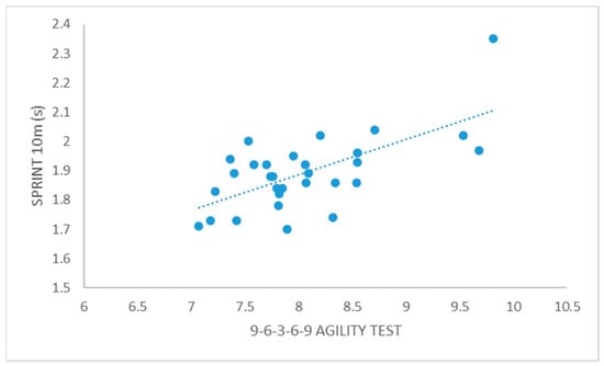 Using Pearson’s correlation analysis (Table 2), the study revealed a series of significant associations among various performance tests. Taking into account the correlation of explosive strength with speed, the highest correlation was found between the CMJA test and the 10 m sprint test (r = −0.675; Table 2; Figure 1). In addition to that, explosive strength tests showed a large correlation with all agility tests, with emphasis on the correlation between CMJA and TT as the highest correlation found (r = −0.632; Table 2; Figure 2). Furthermore, when examining the relationship between speed and agility, the highest correlation was observed between the 10 m sprint test and the 9-6-3-6-9 agility test (r = 0.728; Table 2; Figure 3).