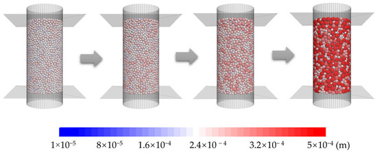 The DEM model parameters used are listed in Table 3. The Hertz–Mindlin contact model is a common choice to model the mechanical interactions of sand particles [31,32]. The inter-particle friction coefficient was set to 0.3, which is within the range of experimentally measured values of quartz sands [33,34]. To expedite quasi-static equilibrium and dissipate internal system energy, a local damping coefficient of 0.7 was used [35]. It should be noted that we adopt quartz-consistent values, including the shear modulus of 28 GPa and Poisson’s ratio of 0.25, as well as the particle density of 2650 kg/m3 following Wu et al. [26], who conducted a one-to-one model calibration against a micro-CT triaxial test and reported excellent agreement between the DEM model and the physical experiment [36].