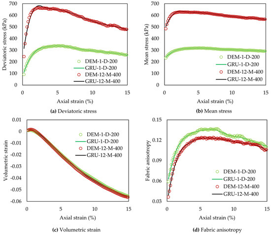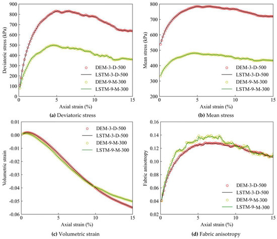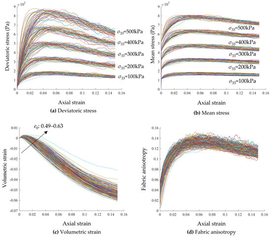 Figure 3a,b present the evolutions of mean stress p and deviatoric stress q, respectively, under confining pressures varying between 100 and 500 kPa. The stress–strain curves are naturally divided into five unique scopes, featuring corresponding peak values of p and q in each range immensely affected by confining stress. Notably, with the increase in confining stress ranging from 100 to 500 kPa, the initial rate of rise and monolithic value of the stress–strain curves exhibit pronounced disparate distribution intervals appearing at a peak point within the range of 150 kPa to 860 kPa, respectively, which is accompanied by a visible phenomenon exhibiting different degrees of strain softening, concerning the initial void ratio, for the selected dense and medium dense granular samples particularly, as well as PSD-related parameters. Additionally, Figure 3c shows the volumetric strain vs. axial strain curves. It is obvious that both dense and medium dense samples undergo varying degrees of compression in the beginning and then convert into volumetric expansion. However, the mechanical behaviour is more intuitive in the dense sample, which presents a higher initial shear modulus and more pronounced behaviour of dilatancy compared to the medium dense one. The fabric anisotropy curves shown in Figure 3d display a relatively consistent pattern regardless of the initial void ratio and confining pressure, which features a monotonic increase up to a peak value within the range of 0.12–0.15 at around 4% to 6% strain and a subsequent gradual decrease to the range of 0.1–0.14 until the end of simulation. Notably, the representative comparisons between DEM simulations and ML predictive targets are selected from the 200 DEM specimens assembled from these controlled initial conditions. They are intended to span the PSD and initial-condition ranges and are depicted in the training, validation, and testing subsets to demonstrate the ML-based model’s reliability across diversity phases, rather than to represent a single “average-PSD” case.