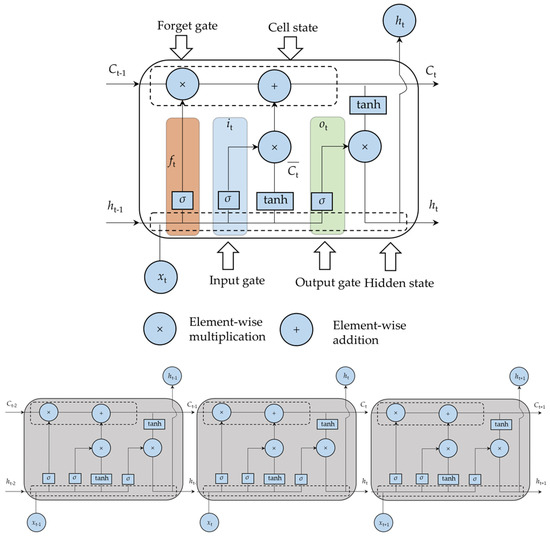 Figure 4 illustrates the schematic diagram and simplified structure of the LSTM-NN architecture to make the LSTM’s functionality more comprehensible. The workflow includes two state elements: a cell state for the long-term memory and a hidden state for the short-term memory. Moreover, a time-dependent LSTM-NN cell comprises three gates, namely, input gate, forget gate, and output gate. These gates are crucial for receiving new and historical information and producing output results.