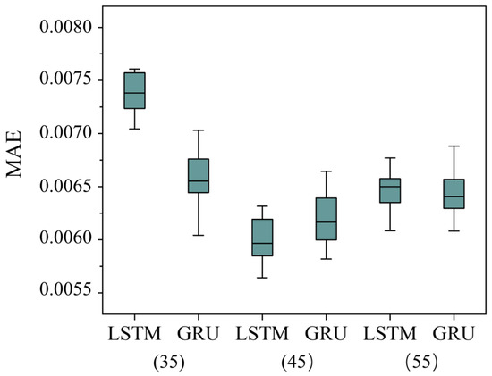 In this study, the dataset derived from DEM simulations was randomly divided into training (70%), validation (15%), and testing (15%) subsets for developing and evaluating the LSTM-NN and GRU-NN models. Specifically, the input parameters contain four initial packing state parameters (i.e., e, σc0, d50, and Cu), along with two mechanical state parameters (i.e., σ33 and ε1), while the four target sequence output variables are the deviatoric stress q-ε1, mean stress p-ε1, volumetric strain εv1, and fabric anisotropy σc1. A sliding window approach was employed to facilitate sequence-to-sequence learning for modeling the constitutive behavior of granular soils, thereby incorporating the history-dependent nature of granular materials into machine learning [6]. To ascertain the most effective sliding window size, different sliding window sizes of 35, 45, and 55 were tested herein. We employed the mean absolute error (MAE) as an error indicator to evaluate the model’s performance. The MAE is calculated using the formula M A E = i = 1 n | y ^ i y i | / n , where y ^ i denotes the predicted value of the concerned variable; y i denotes the actual value of the concerned variable; and n denotes the number of data point. The error values of the MAE associated with different sliding window sizes are shown in Figure 6.