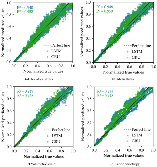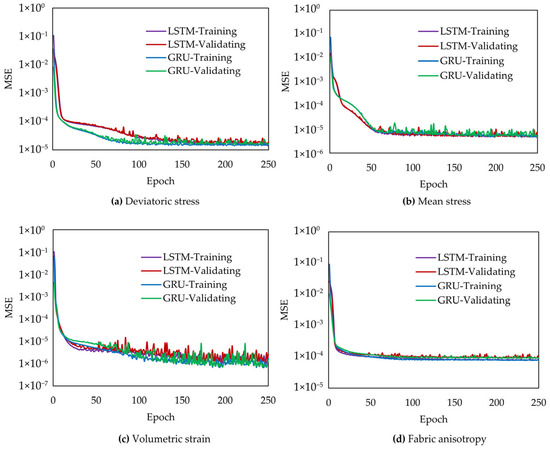 Figure 7 shows the evolution of the MSEs of the fabric anisotropy σc (Equation (1)), volumetric strain εv (Equation (4)), deviatoric stress q (Equation (3)), and mean stress p (Equation (2)) during the training and validating stages of the LSTM-NN and GRU-NN models. In this study, the DEM-derived database was randomly split into three subsets. Specifically, 70% of the dataset was allocated for regulating ML-based models’ trainable parameters in the training set, while 15% for validation was employed to evaluate the ML-based models’ performance on independent data at each training epoch without participating in backpropagation, thereby mitigating overfitting risks, as well as facilitating the hyperparameter tuning process (e.g., learning rate, batch size, optimizer, activation function, and network architecture).