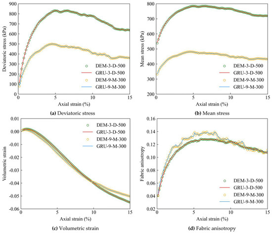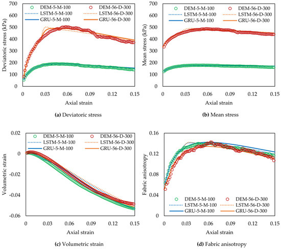 Figure 8 and Figure 9 present the training results of LSTM-NN and GRU-NN for predicting the relationship between p, q, εv, σc, and ε1. The curves are denoted by a code with a format of ‘DEM/LSTM/GRU-a-D/M-b’, in which the approach used is represented by either DEM, LSTM, or GRU, ‘a’ represents the ID of the particle size template, ‘D’ or ‘M’ denotes the type of sample, either dense or medium dense, and ‘b’ represents the confining pressure. Each input sub-sequence and its next-step targets form a training sample, enabling the ML-based modeling to learn the loading history dependency of the mechanical responses of the granular samples. It is observed that during the training process, the predictions of both ML-based models closely match the DEM simulation data for all target variables. These results show the strong capability of ML-based models in learning the macro and micro mechanical behaviours of granular soils.