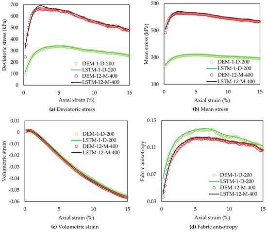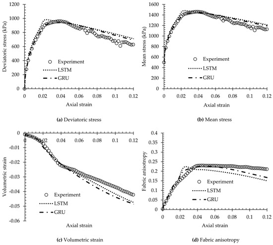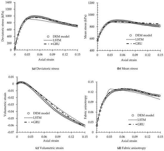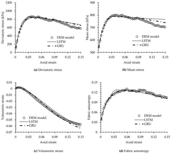 It will be desirable to apply the trained LSTM-NN and GRU-NN to predict the constitutive behaviour of a miniature spherical glass bead sample subjected to triaxial shearing, as observed in the micro-CT tests by Cheng and Wang [44]. We gathered all essential initial variables necessary for the ML-based model prediction from Cheng and Wang [44]. These input data encompassed parameters such as the initial void ratio, initial fabric, particle size distribution (PSD) characteristics, and the evolution of key variables like deviatoric stress, mean stress, volumetric strain, and fabric anisotropy in relation to axial strain. Specifically, for the glass bead sample, the input parameters were as follows: mean particle size = 0.4 mm, uniformity coefficient = 1.29, initial void ratio = 0.49, initial fabric = 0.003, and confining pressure = 500 kPa. It should be noted that the DEM simulations have been thoughtfully set up to mimic the micro-CT test by adopting a set of DEM models and material properties that are very close to those of the physical test, including the simplified spherical particle shapes and similar sample dimensions, particle size distribution (PSD) characteristics, and loading rates.