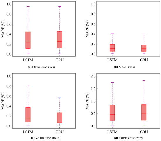 Figure 13 and Figure 14 present the box plots of MAPE and R-square for all of the testing datasets. The red horizontal lines represent the mean values of MAPE and satisfactory value of R-square, which signifies the overall performance of the LSTM-NN and GRU-NN. The maroon boxes represent the main error ranges of MAPE for all variables, while the top and bottom scale bar denote the maximum and minimum values of MAPE, respectively. It is found that the MAPE values of all modelled variables from the testing datasets are around 0.2%, while R-square is larger than 0.94, except for the fabric anisotropy, whose MAPE values are approximately 0.5%, with R-square = 0.936 and 0.948 for the LSTM-NN and GRU-NN, respectively, which displays a generally worse prediction with higher error than the other three variables. This result suggests that the fabric anisotropy becomes more oscillatory when the sample reaches the critical state, which agrees well with the observation made by Wu et al. [26].