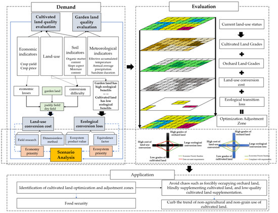 To further optimize the layout of cultivated land, this study conducted evaluations of cultivated land quality, orchard land quality, ecological conversion loss, and land-use conversion costs (based on economic losses and conversion difficulty), using economic indicators, land use, soil indicators, and meteorological indicators, etc. Thirteen typical scenarios in three categories, including general scenarios, economic priority, and ecological priority, are divided to identify the cultivated land optimization and adjustment zones. The results will be applied to the implementation of the food security strategy, effectively avoiding the blind occupation of orchards to supplement cultivated land and the poor quality of the supplemented cultivated land, so that agricultural land can truly be used efficiently and fulfill their respective functions, thereby curbing the trend of non-agricultural and non-grain use of cultivated land (Figure 1).