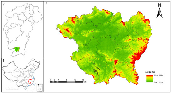 The study area is located in Xinfeng County, Ganzhou City, Jiangxi Province, between 24°59′ N–25°33′ N and 114°34′ E–115°59′ E, a key town in southern Jiangxi adjacent to Guangdong Province. Its terrain features medium-low mountains in the east, south, and northwest, low hills in the southwest and north, and low hilly plains in the central region, sloping from south to north (Figure 2). Xinfeng County has a subtropical monsoon humid climate with a long frost-free period. It has diverse land structure types, with land use dominated by cultivated land and forest land. Orchard land has developed rapidly, primarily focused on fruit agriculture (navel oranges). As the birthplace of Gannan navel oranges, it has a 50-year history of navel orange cultivation.