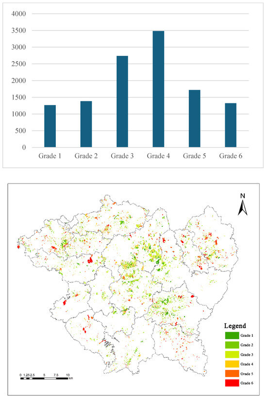 With reference to the Regulation for gradation on agriculture land quality, the adjusted evaluation parameters and indicator system were applied to calculate the cultivated land quality grades for orchard map patches in Xinfeng County. Among them, based on the local actual land use and economic development conditions, the land-use coefficients and land economic coefficients for different crops in Xinfeng County were calculated, and the land economic grade index was selected as the final cultivated land grade score. The cultivated land grades are divided with a grade difference of 200 economic grade indices. Nationally, cultivated land is classified into fifteen grades in total, where Grade 1 represents the highest quality cultivated land and Grade 15 represents the lowest quality. Nationwide, cultivated land is divided into superior land (Grades 1–4), high-quality land (Grades 5–8), medium-quality land (Grades 9–12), and low-quality land (Grades 13–15). The grades of potential cultivated land optimization and adjustment zones in Xinfeng County’s orchard land are concentrated between Grade 7 and Grade 13.