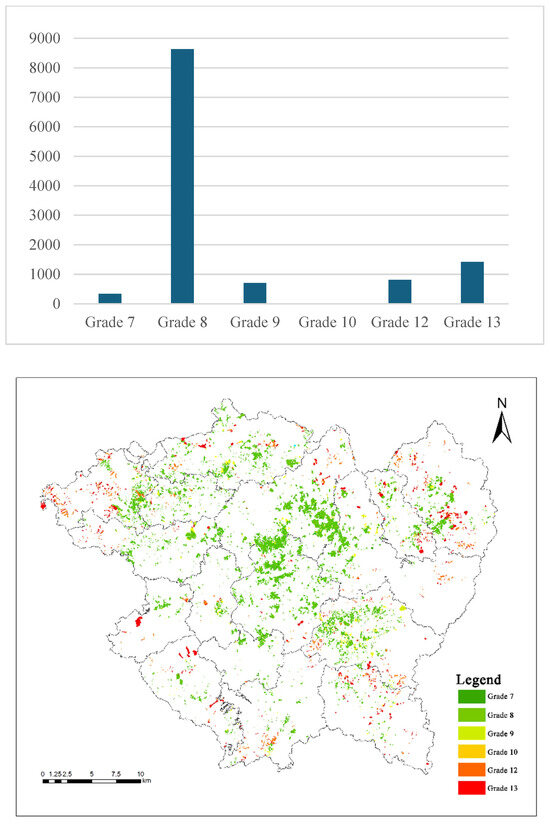 The quality grades of all potential cultivated land in Xinfeng County range from Grade 7 to Grade 10 and from Grade 12 to Grade 13, with Grade 8 being the most prevalent. Dry land is entirely distributed in Grades 12 and 13, while paddy fields are exclusively located in Grades 7 to 10. The area of Grade 8 cultivated land is 8636.49 hm2, accounting for 72.5% of the total cultivated land area. High-grade cultivated land in Xinfeng County is primarily distributed in the central plain area, with a small portion of high-quality cultivated land scattered in the surrounding mountainous areas, most of which are classified as Grade 8. Low-grade cultivated land is mainly distributed in the mountainous areas of the southern and northeastern regions, with the majority of these lands classified as Grade 13 (Figure 4).