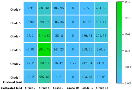 Without considering other factors, the existence of some map units where the quality of cultivated land is significantly higher than that of orchard land indicates considerable potential for converting orchard land to cultivated land based on natural background conditions. When all orchard land is converted to cultivated land, 4978.54 hm2 of land are converted from Grade 3 or 4 orchard land to Grade 8 cultivated land, accounting for 41.84% of the total area of orchard map units. This indicates that medium-quality orchard land can be converted into medium-quality cultivated land in substantial quantities, effectively compensating for cultivated land losses and contributing to food security through rational land-use conversion. In addition, 1719.95 hm2 of low-quality orchard land can be converted into medium-to-high-quality cultivated land, accounting for 14.46% of the total area of map units (Figure 5). The reclamation and development of this low-quality orchard land should form the core of cultivated land optimization and adjustment. This approach can not only safeguard the quantity of cultivated land and increase grain production but also prevent excessive harm to the interests of farmers and local governments, ensuring the concurrent development of food security and economic benefits. It provides a fundamental basis for the subsequent proposal of multi-dimensional evaluations to identify cultivated land optimization and adjustment zones.