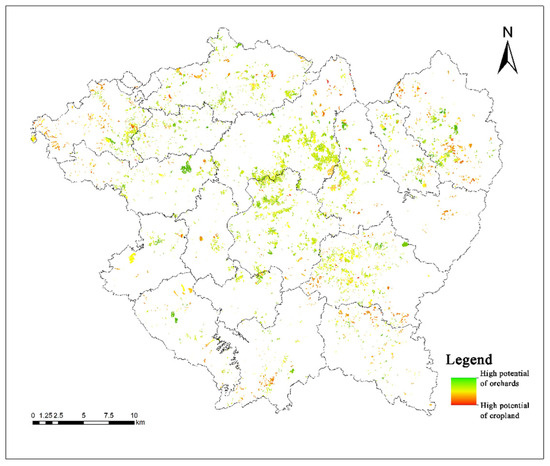 In all scenarios, the optimization and adjustment zone under the MMEG scenario has the largest area, covering 5139.26 hm2 of orchard land available for conversion into cultivated land. In contrast, the zone under the LHEM scenario has the smallest area, with only 174.79 hm2 of orchard land suitable for conversion. The difference between the two is nearly thirty-fold, indicating a substantial disparity in usable land resources. Meanwhile, the optimization and adjustment zones identified under the ecological priority scenario are consistently larger than those under the economic priority scenario, suggesting that economic constraints, rather than the current ecological condition of orchard land, are the primary factors limiting land-use conversion.