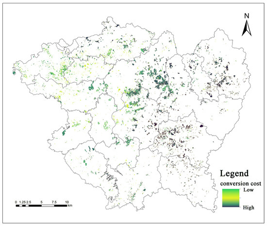 Considering the different units and incomparable numerical values among different factors, this study standardizes the slope, remediation attributes, and corresponding crop output value loss of land type map patches [29,30]. A series of values ranging from 0 to 1 in the study area are finally obtained as the land type conversion cost, indicating the economic difficulty level of land type conversion.