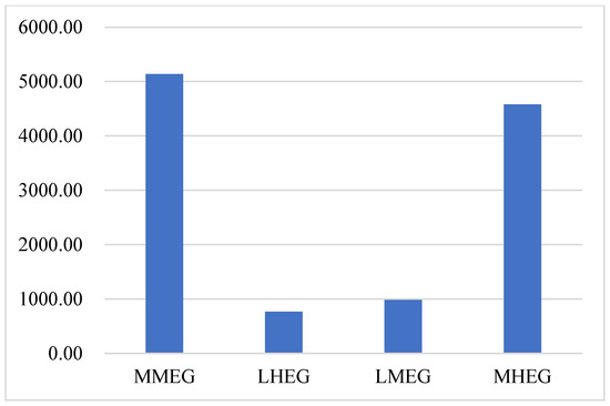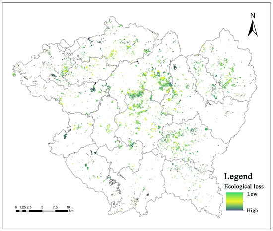In the ecological priority scenario, the optimization and adjustment zone under the MMEG scenario covers the largest area, measuring 5139.26 hm2, accounting for 43.14% of the total orchard land (Figure 15). Centralized development of optimization and adjustment zones in the mid-northern region of Xinfeng County can substantially minimize ecological benefit losses (Figure 16). In the LHEG scenario, the optimization and adjustment zone is the smallest, covering only 766.79 hm2 (6.44% of the total orchard land), indicating that under the ecological priority strategy, the development direction has shifted to the mid-northern and northeastern regions. Compared with the LHEG scenario, the MMEG scenario demonstrates that differences in orchard land grades greatly influence the selection scope of cultivated land optimization and adjustment zones—the area difference is nearly seven-fold—but exert little impact on the overall distribution trend. Total ecological and economic value losses also decrease in the order of MMEG, MHEG, LMEG, and LHEG. In particular, ecological loss in the LHEG scenario is less than one-sixth of that in the MMEG scenario, representing a substantial difference.