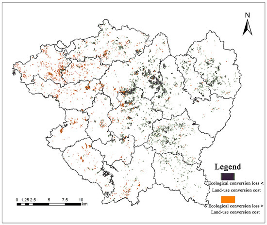 In this scenario, priority is given to minimizing the impact on ecological benefits, while considering the limitations of government subsidies; damage to economic benefits is required to be controlled within a certain range. Therefore, areas with ecological losses above the average are designated as non-development zones. These areas account for more than 80% of the orchard land area in Xinfeng County, and they typically exhibit higher natural connectivity and more significant ecological values, effectively ensuring that the ecological benefits of orchard land are maintained. Thus, the ecological conversion loss factor is assigned a range of 0–0.094. To minimize economic losses, the government subsidy value is maximized based on actual fiscal revenue and expenditure conditions. Therefore, the land-use conversion cost factor assumes values ranging from the minimum to the ratio of the maximum subsidy standard for “converting orchard land to cultivated land” to the maximum economic loss (0–0.357).