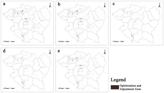 Spatial distribution of GS cropland optimization and adjustment zones. Note: These maps represent the spatial distribution of cultivated land optimization and adjustment zones identified under five modes in the general scenario. (a) GS; (b) MMGS; (c) LHGS; (d) LMGS; (e) MHGS.