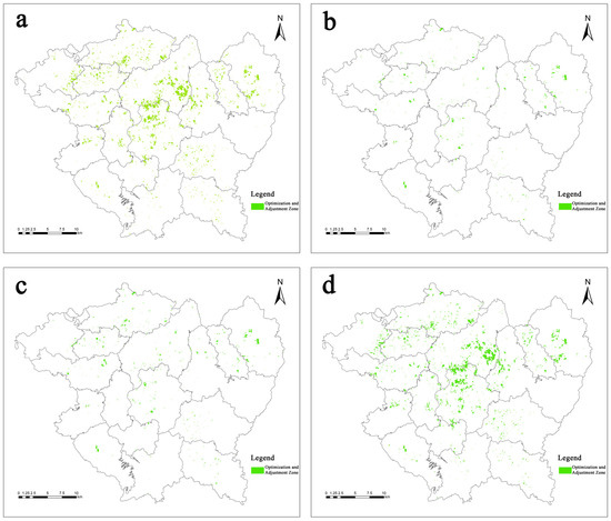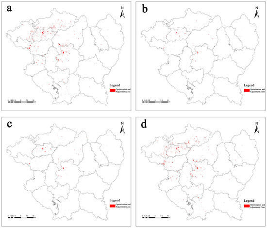 Spatial distribution of cultivated land optimization and adjustment zones in the ecological priority scenario. Note: These maps represent the spatial distribution of cultivated land optimization and adjustment zones identified under four modes in the ecological priority scenario. (a) MMEG; (b) LHEG; (c) LMEG; (d) MHEG.