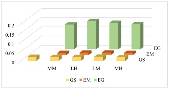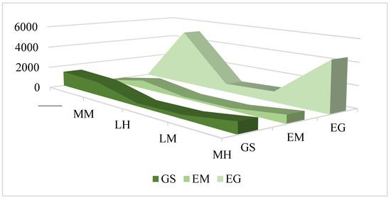 In the LH and LM scenarios (i.e., LHGS, LHEM, LHEG, LMGS, LMEM, LMEG), the area of cultivated land optimization and adjustment zones is consistently below 1000 hm2, which is significantly lower than that in the MM and MH scenarios (MMGS, MMEM, MMEG, MHGS, MHEM, and MHEG) as well as in the GS scenario (Figure 17). This suggests that orchard land grade exerts a substantial influence on the identification of cultivated land optimization and adjustment zones. The predominance of medium-grade orchard land, typically associated with relatively low ecological value, may explain this outcome.