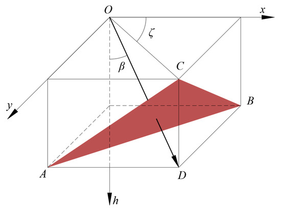 As shown in the study by Luan et al. [36], the dependence of the internal friction angle on the principal stress direction can be neglected, and it can be assumed that only the cohesive force is related to the principal stress direction. Therefore, this paper assumes that the internal friction angle is constant and only considers the heterogeneity and anisotropy of the cohesive force. Liao et al. [37] found that the cohesion of soil in non-horizontal layered strata varies linearly along non-vertical directions, and established a spatially nonhomogeneous model, as shown in Figure 2. The O of the coordinate system is on the ground, with the x-axis going the direction of tunnel excavation and the centre of the tunnel working face on the h-axis. The ABC plane is the structural plane of the inclined layered soil layer, OD is perpendicular to the ABC plane, and OC is the projection of OD on the xOy plane. The inclined angle of soil layer β is defined as the angle between the ABC plane and the horizontal plane. β is at an angle of 0° to 90°. The nonhomogeneously directional angle ζ is defined as the angle formed between the x-axis and OC. The nonhomogeneously directional angle ζ satisfies 0° ≤ ζ ≤ 360°. ρ is the nonhomogeneous coefficient. The initial cohesion c0 is the cohesion at point O. The equation of plane ABC in the spatial coordinate system is expressed as follows: