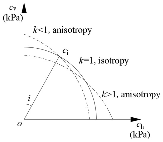 The anisotropy of cohesion is shown in Figure 3, where cv and ch are the horizontal and vertical principal cohesion forces, respectively. The ratio of ch to cv is k, where k is the anisotropy coefficient. The angle between the first principal stress and the vertical direction is denoted by the letter i. The ψ is the angle between the first principal stress and the failure plane. According to the research of Zhang and Zhang [38], assuming ψ is 35°, the expression for cohesion can be obtained as follows: