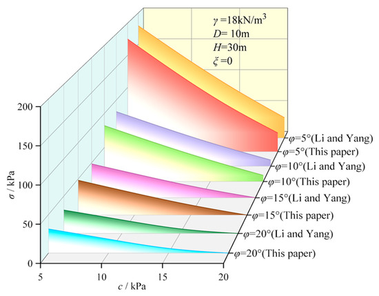 This section discusses the effect of different tensile strength reduction parameters ξ on the parameter σ. The ultimate support force at the tunnel working face under different ξ values is presented in Table 4. The calculation parameters are listed as follows: γ = 18 kN/m3, D = 10 m, H = 10 m, k = 1, ζ = 0°, ρ = 0 kPa/m, the range of the parameter c0 is 6 kPa to 18 kPa, and the range of the parameter φ is 5° to 25°. As the parameter ξ increases from 0 to 1, the ultimate support force gradually decreases. When the parameter c0 and the parameter φ are small, changes in the parameter ξ have a minimal effect on the ultimate support force. For example, when the parameter c0 is 6 kPa and the parameter φ is 5°, increasing the parameter ξ from 0 to 1 yields a marginal reduction of roughly 0.18% in the ultimate support force. When the parameter c0 and the parameter φ are large, changes in the parameter ξ exert a substantial influence on the ultimate support force. For example, when the parameter c0 is 16 kPa and the parameter φ is 20°, increasing the parameter ξ from 0 to 1 reduces the ultimate support force by approximately 58.32%. At this juncture, in the absence of consideration for tensile strength cut-off, the ultimate support force diminishes by approximately 75.22% in comparison with the scenario where the parameter ξ is set to 0. Analysis indicates that when the parameter c0 is small, the influence of tensile strength cut-off on support force proves negligible; however, when the parameter c0 is large, ignoring this failure mechanism will significantly underestimate the required support force. Therefore, tensile strength cut-off must be considered in support force design, especially in soils with large c0 parameter values.