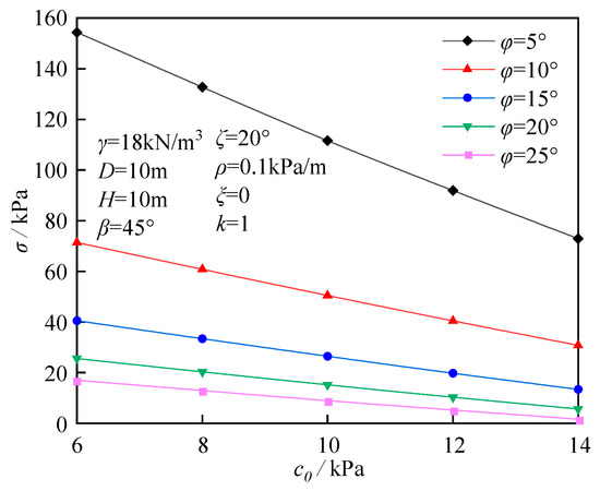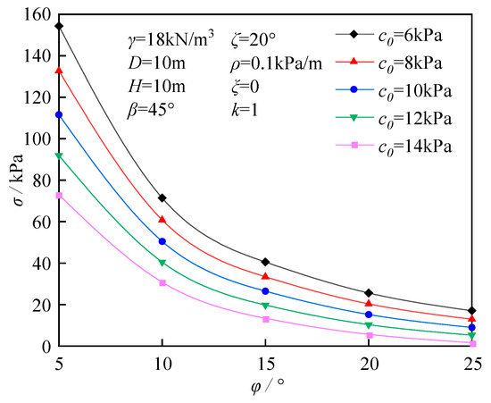 Figure 7 depicts the influence of initial cohesion c0 on the ultimate support force σ. When other parameters remain constant, the parameter σ decreases linearly with increasing initial cohesion c0. As the parameter φ decreases, the slope of this linear relationship gradually increases. This indicates that an increase in initial cohesion c0 enhances tunnel stability, consequently reducing the necessary support force for stability maintenance. The effect of the parameter φ on the parameter σ is illustrated in Figure 8. When other parameters remain constant, an increase in parameter φ is accompanied by a decrease in parameter σ, which exhibits a trend from steep to gradual.
