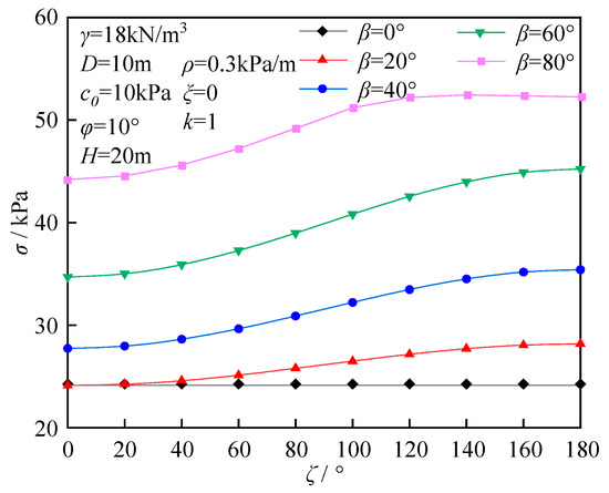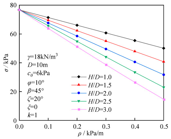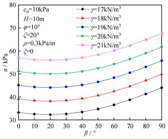 The influence of the nonhomogeneous coefficient ρ on the ultimate support force is shown in Figure 9. As the parameter ρ increases, the ultimate support force decreases linearly; however, as the parameter H/D increases, the slope of this linear relationship gradually increases. When the parameter ρ is 0, the ultimate support force is independent of the parameter H/D. The effect of the nonhomogeneously directional angle ζ on support force is shown in Figure 10. When the parameter β is constant (β ≠ 0), as the parameter ζ increases, the parameter σ increases nonlinearly, with the growth rate first increasing and then decreasing. When the parameter ζ is 90°, the growth rate reaches its maximum value. Additionally, when the parameter ζ is constant, as the parameter β increases, the parameter σ increases nonlinearly. Therefore, when designing the direction of tunnel excavation, reducing the parameter ζ can effectively lower the parameter σ requirements at the working face. The effect of the inclined angle of the soil layer β on the parameter σ is shown in Figure 11. Under identical conditions, as the parameter β increases, the ultimate support force exhibits a nonlinear change, first decreasing and then increasing, reaching a minimum value when the parameter β is between 10° and 30°. When the parameter β is constant, the parameter σ increases linearly with increasing soil weight γ.