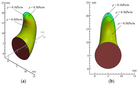 Figure 16 illustrates the impact of the anisotropic coefficient k on the failure plane. The model parameters are configured as follows: γ = 18 kN/m3, D = 10 m, c0 = 10 kPa, φ = 10°, H = 20 m, β = 45°, ζ = 45°, ρ = 0.3 kPa/m, and ξ = 0. With the change in the anisotropic coefficient k, the extent of the damage has little effect, that is, the volume and height of the damaged body do not change significantly.