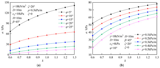Figure 15 presents the influence of the anisotropic coefficient k on the ultimate support force. Figure 15a illustrates the following: When the parameter φ is constant, the ultimate support force increases nonlinearly with increasing k, exhibiting a trend from steep to gentle. When the parameter φ decreases, the growth rate gradually increases. Additionally, when the parameter k is constant, the parameter σ increases nonlinearly with decreasing internal friction angle φ, exhibiting a trend from gentle to steep. It is worth noting that the larger the parameter φ, the smaller the impact of changes in the direction angle of heterogeneity on the parameter σ. Figure 15b demonstrates that when other conditions are the same, the larger the parameter ρ, the lower the growth rate of the ultimate support force as the parameter k increases. When the parameter ρ decreases to a certain extent, its effect on the ultimate support force tends to be limited.